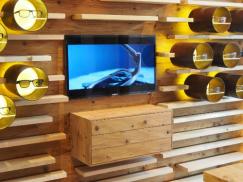 Präsentationswand gefertigt aus ausgesuchten heimischen Laubhölzern für die Tablare, die Rückwand wurde aus gehacktem Thermoholz (Altholz Effekt) hergestellt